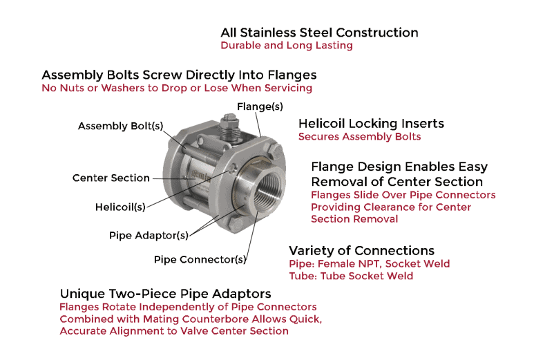 Three-piece ball valves are manufactured with one main body and two pipe connectors. The pipe connectors are typically threaded or welded to a pipe. This enables the main body to be easily removed for cleaning or repairs without having to remove the pipe connectors. Full port and bidirectional shutoff options are also available.