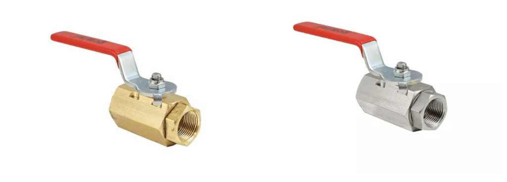 Left: A manual two-piece brass ball valve; Right: A manual two-piece stainless steel ball valve.