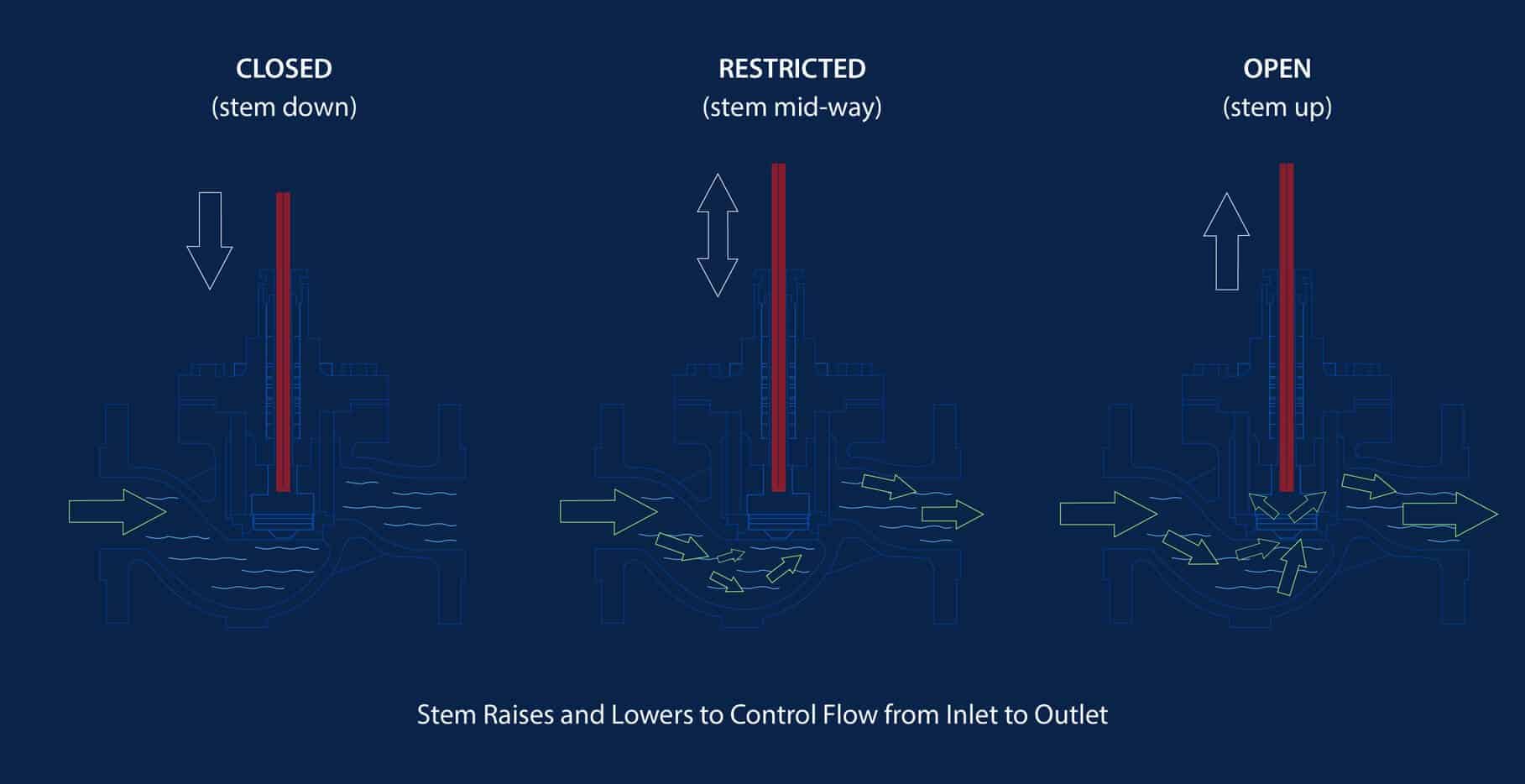 Globe valves are designed so that the media flowing through them does not travel in a straight line. Rather than encountering a perpendicular blockage at the valve, the media must take a slight vertical detour up through the valve cavity, where it meets the plug disc. As the valve stem is turned via wheel and raises to allow media through, the disc moves parallel to the flow. The position of the stem tells operators whether the valve is open or closed.