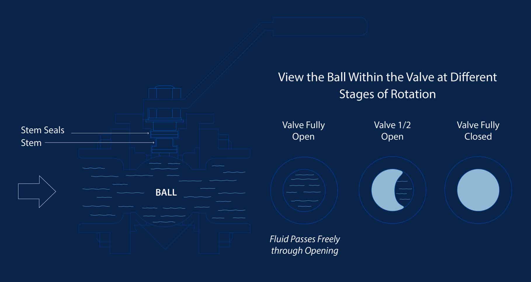 Unlike gate or globe valves, ball valves are a type of quarter-turn valve that utilizes a bead shaped ball with a hole in the middle to control the flow of media. Called a bore or port, the hole in the middle of the ball allows media to pass through the valve body when opened, and is rotated 90 degrees to stop flow. The port is aligned perpendicular to the valve body in the closed position.