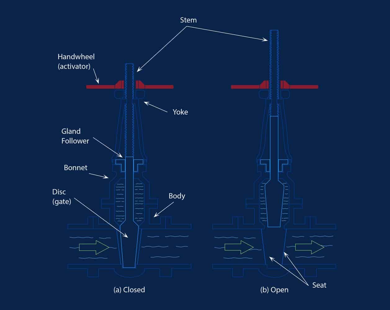 When a gate valve is activated, the stem will turn clockwise or counter clockwise to raise or lower the disc inside the pipe. In its closed position, the disc lodges between the seats in the base of the valve, providing a full stop at a right angle to the media flow. The disc can be shaped like a wedge, knife or parallel panel.
