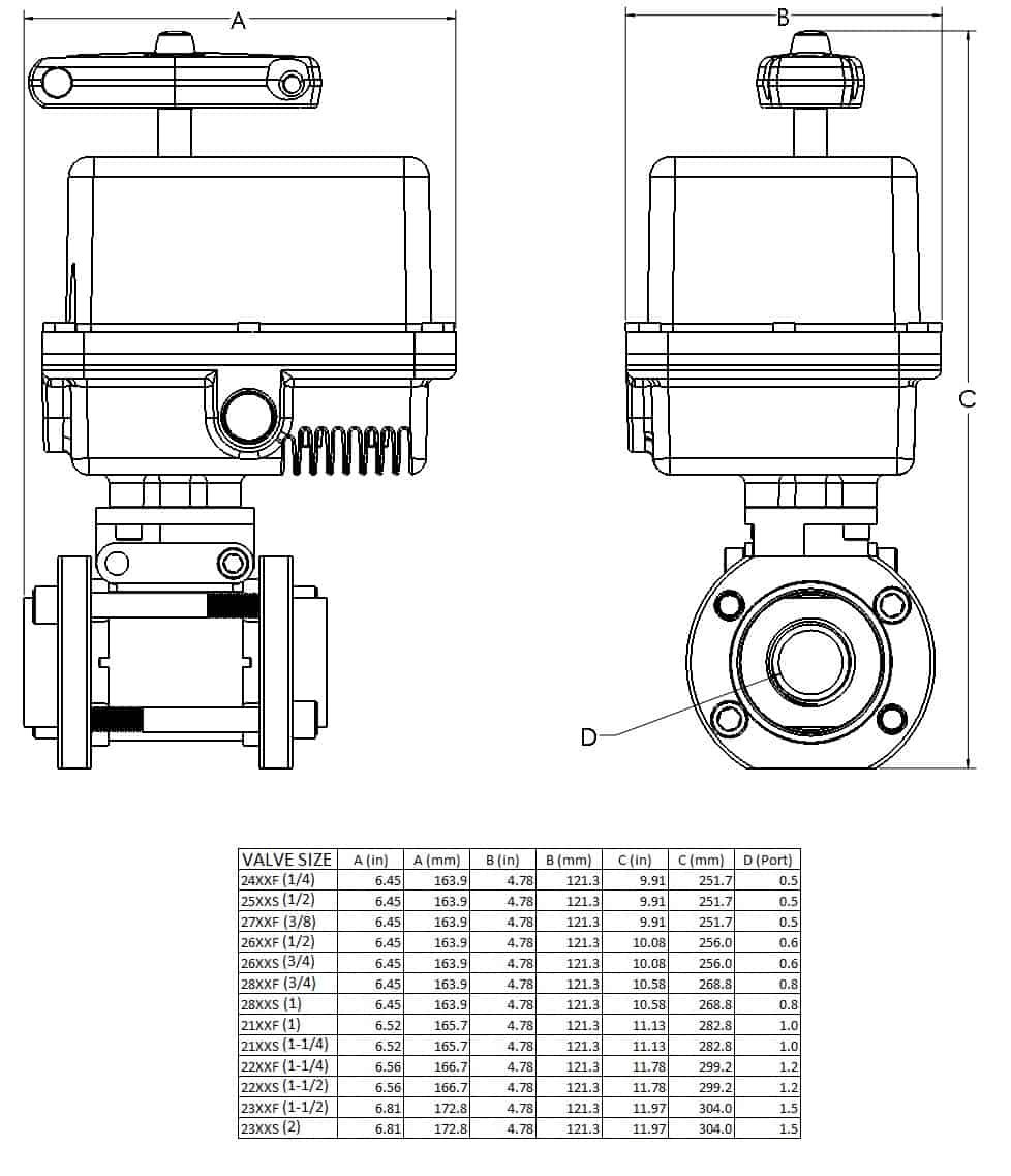 Valve is operated by 12VDC Electric Actuator with a cycle (index) time of six seconds. Actuator is power on / power off utilizing cam switches to start and stop motor at close / open positions. Actuator controlled by user provided DPDT (Double Pole, Double Throw) switch or device. Temperature Rating 40°F to 150°F (4.4°C to 65.5°C). Duty Cycle 100%, Amps full load 1.0. Electrical connection: (2) Conduit ½” ports. Capacitor run motor with auto reset thermal overload protection. Permanently lubricated – maintenance free gear train. DuPont® FR50 cover with Teflon® coated cast aluminum base. Fold out manual override handle. NEMA 4X Enclosure.