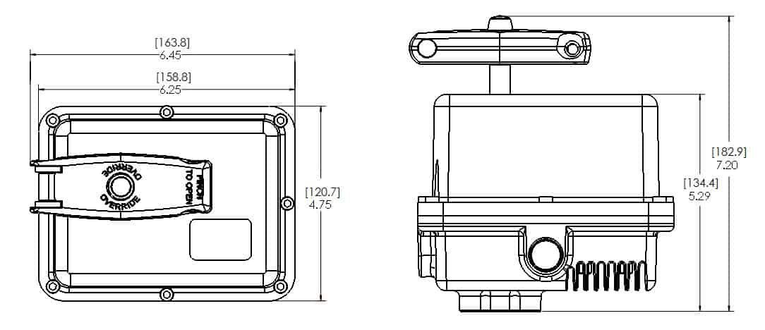 Electric Actuator (24VDC) with a cycle (index) time of six seconds. Actuator is power on / power off utilizing cam switches to start and stop motor at close / open positions. Actuator controlled by user provided SPDT (Single Pole, Double Throw) switch or device. Temperature Rating 40°F to 150°F. Duty Cycle 75%, Amps full load 0.5. Electrical connection: (2) Conduit ½” ports. Capacitor run motor with auto reset thermal overload protection. Permanently lubricated – maintenance free gear train. DuPont® FR50 cover with Teflon® coated cast aluminum base. Fold out manual override handle. NEMA 4X Enclosure. Suitable for General Industrial Series, Serviceable Series and Compression End Series. Also see Product Specifications which can be found at www.geminivalve.com Products are marketed per Gemini Valve Standard Terms & Conditions. All Gemini Valve Products MADE IN USA.