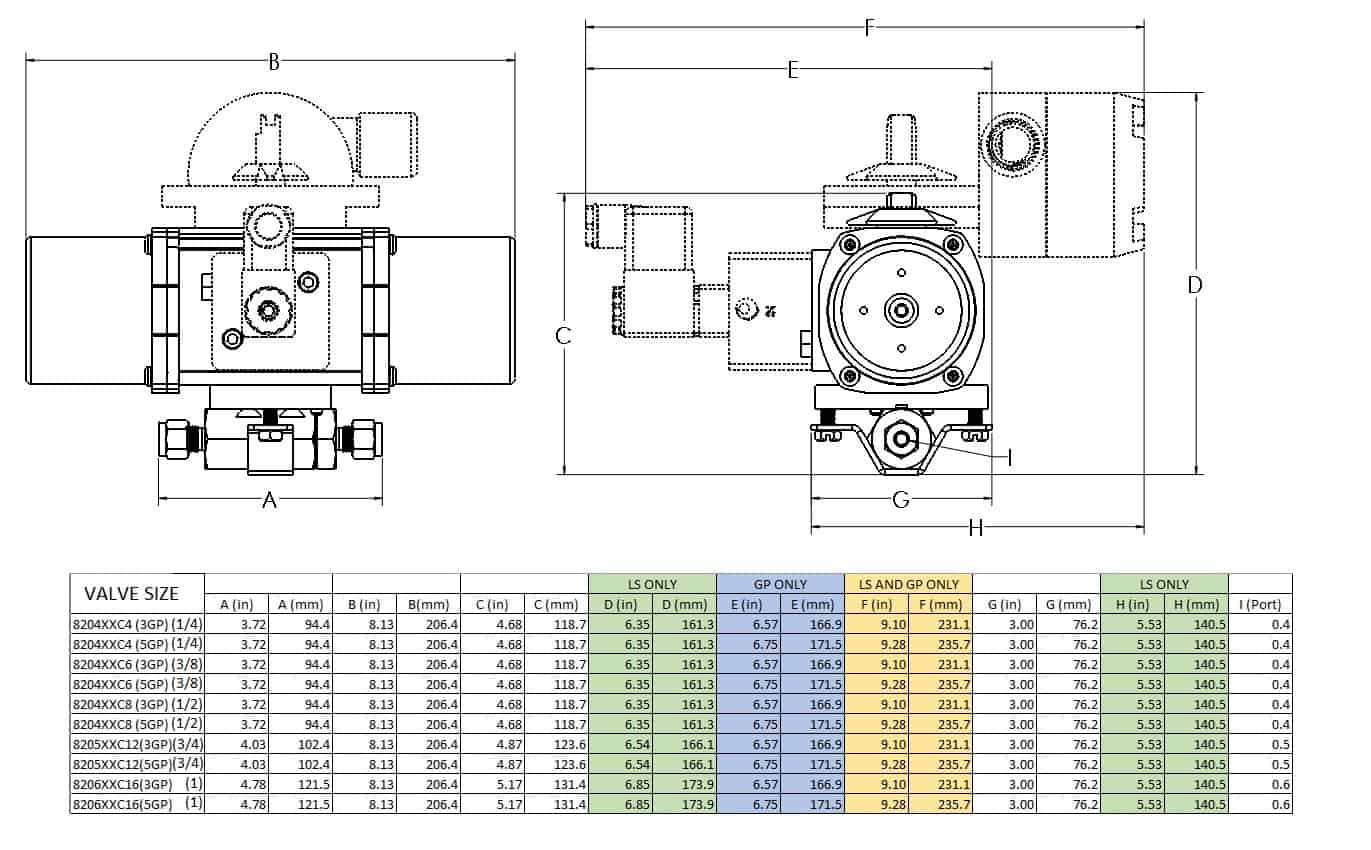 Valve is operated by Spring-Return (Air to Close / Spring to Open) Pneumatic Actuator which operates on 60-125 psi air supply with an cycle (index) time of 1/2 to 1 second depending on model and load. Temperature Rating -20°F to 350°F (-28.8°C to 176.6°C). Air connection is NAMUR / (2) 1/8” NPT female ports to enable direct NAMUR or remote solenoid valve piloting. Actuator body aluminum with Teflon® impregnated hard anodized surfaces. Hardware 300 Series Stainless Steel. Permanently lubricated – maintenance free. Visual Open / Close indicator.
